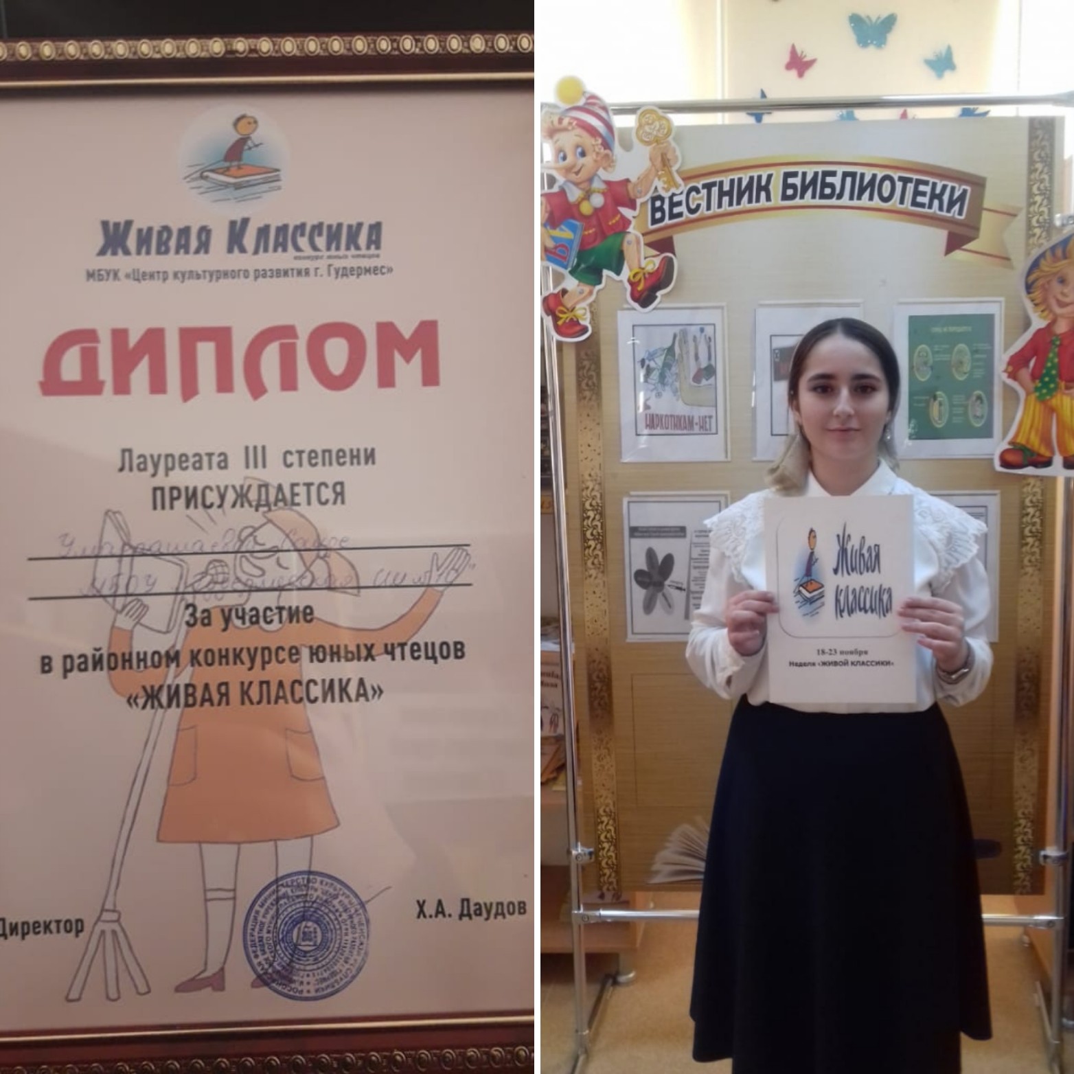 18.12.2019 года прошел районный конкурс чтецов "Живая классика". Ученица 8 г класса МБОУ "ГУДЕРМЕССКАЯ СШ10" Умарпашаева Саида заняла 3 место,среди 43 школ, с чем мы её поздравляем и желаем дальнейших творческих успехов.