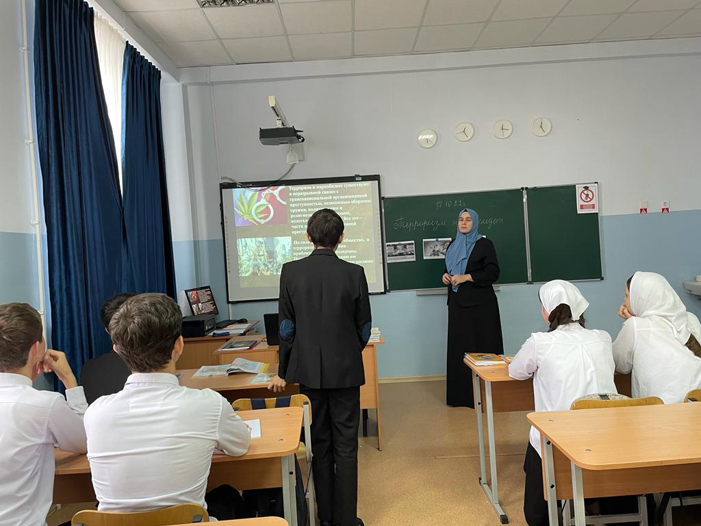 Учитель ОБЖ Джамбекова И. Г. В 8-9-10 классах провела беседу на тему "Терроризм не пройдёт", посвящённое борьбе с идеологией терроризма и экстремизма. Учащиеся в свою очередь задавали вопросы интересующие их, до учащихся доведена информация о последствиях нарушений закона Российской Федерации.