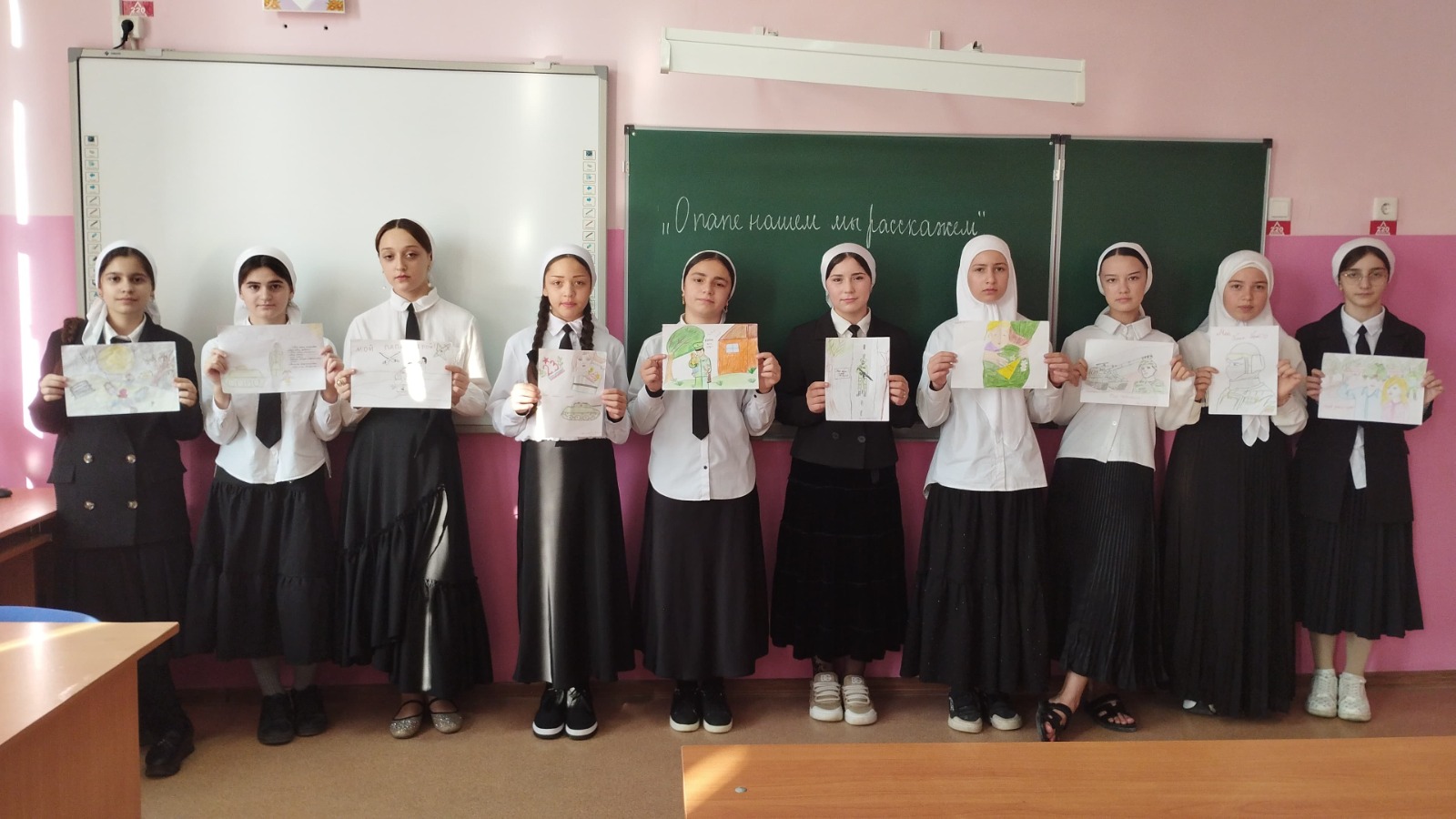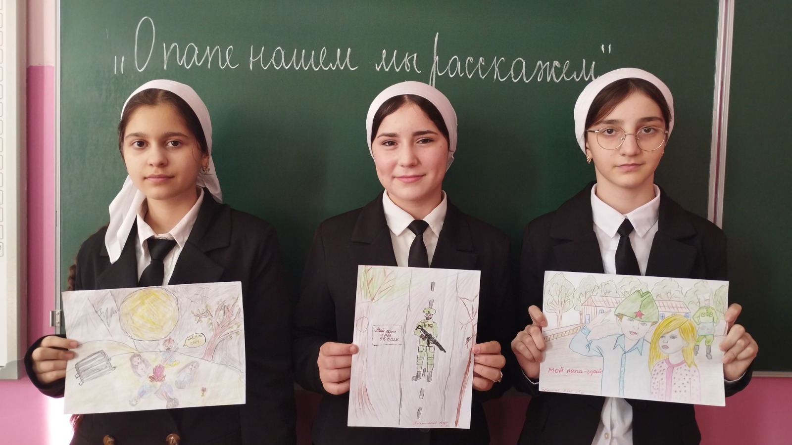 Конкурс чтецов «О папе нашем мы расскажем» провели классные руководители 5 –ых классов, каждый участник старался занять почетное место, тем более когда в стихи были о папе, классные часы «Отец. Отчество. Отчество» провели в 6 –ых классах, а также провели конкурс рисунков «Для меня герой -мой папа», где номинация «Лучший рисунок о папе» выиграли ученики 5 «Б» класса Бибулатов Асхаб и Габаева Хеди.