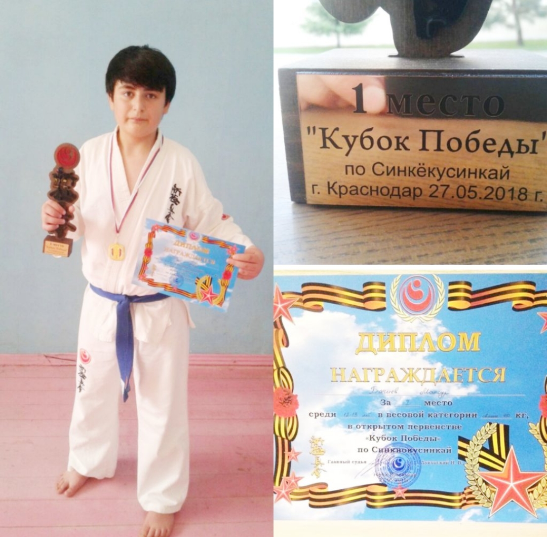 27.05.2018Бачиев Мансур, ученик 7 а класса, занял 1 место в открытом первенстве "Кубок победы" по Синкиокусинкай, которое проходило в городе Краснодар. Мы поздравляем юного спортсмена с очередной победой и желаем успехов в учебе и спорте.
