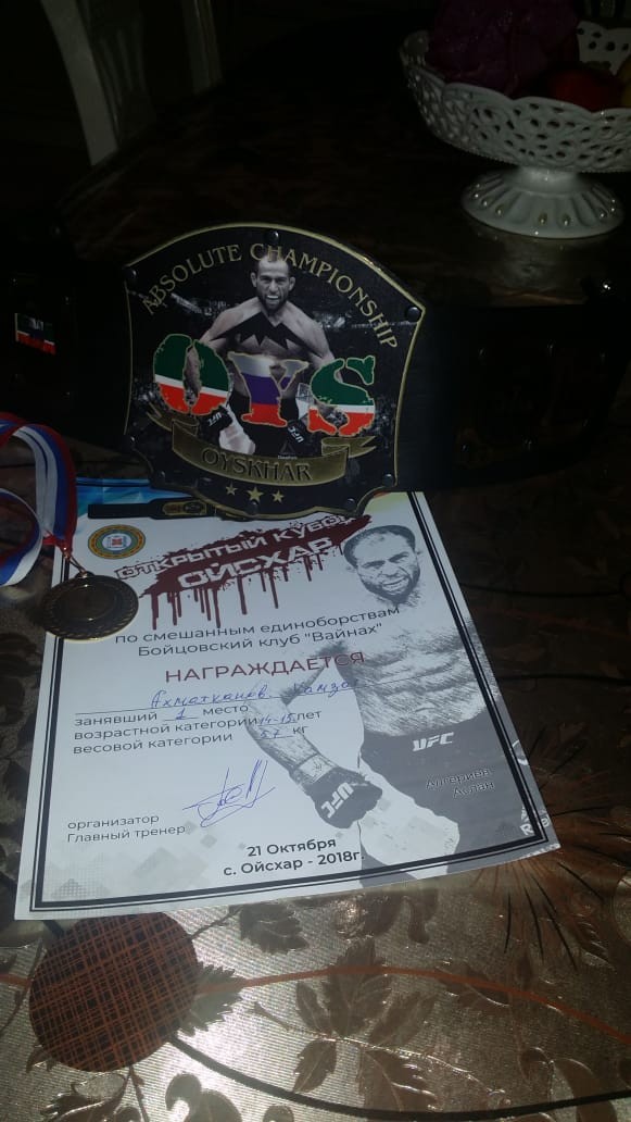 Ахматханов Хамзат ученик 10 "А" класса МБОУ "Гудермесская СШ10", занял I место в турнире по смешанным единоборствам в Бойцовском клубе "ВАЙНАХ" с.Ойсхар в возрастной группе 14 – 15 лет в весовой категории 57 кг.